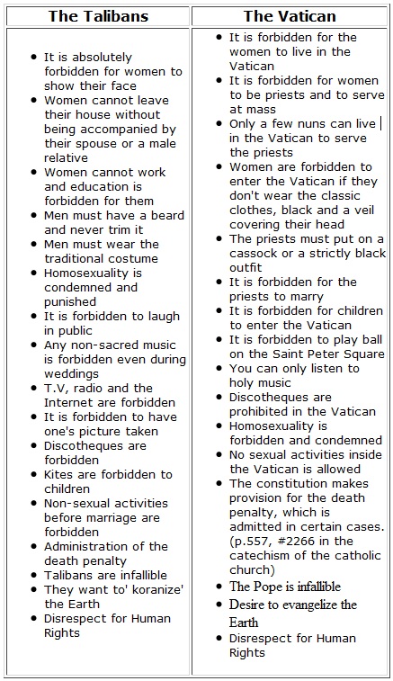 The Vatican and its laws are every bit as bad as the Talibans! Would we have double standards?